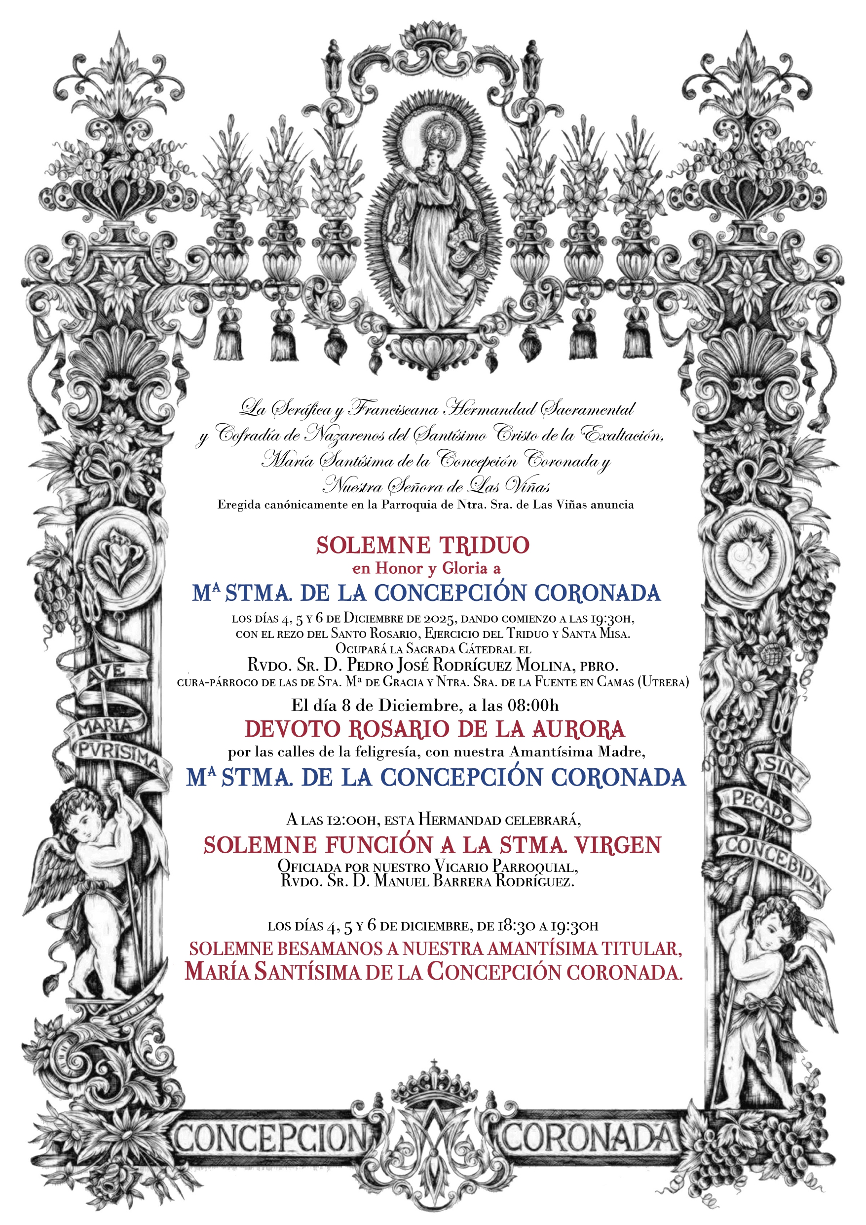 Durante los días 4, 5 y 6 de diciembre tendrá lugar el Solemne Triduo en honor a María Santísima de la Concepción Coronada, dando comienzo a las 19:30 horas con el rezo del Santo Rosario, Ejercicio de Triduo y celebración de la Santa Misa, ocupando la Sagrada Cátedra el Rvdo. Sr. D. Pedro José Rodríguez Molina, Pbro. cura-párroco de Santa María de Gracia y Nuestra Señora de la Fuente de Camas (Utrera).